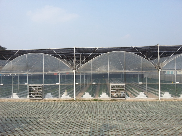 連棟薄膜溫室主要是以薄膜作為覆蓋材料的連棟溫室。一棟完整的連棟薄膜溫室主要包括溫室土建基礎部分、主體熱鍍鋅鋼骨架、外遮陽熱鍍鋅鋼骨架、覆蓋材料、外遮陽系統(tǒng)、內(nèi)保溫系統(tǒng)、濕簾-風機降溫系統(tǒng)、頂部及四周卷膜開窗系統(tǒng)、噴淋系統(tǒng)、配電系統(tǒng)、排水系統(tǒng)等。 連棟薄膜溫室采用熱鍍鋅鋼制骨架、頂部及四周采用雙層高保溫長壽無滴塑料膜,四周也可采用國產(chǎn)聚碳酸酯板材料,是溫室中一種簡單的保溫節(jié)能形式,它有保溫性能良好、操作簡便等優(yōu)點,適合于花卉種植、種苗繁育、花卉市場、科研、教學等,是以后溫室節(jié)能保溫技術的一個發(fā)展應用方向。